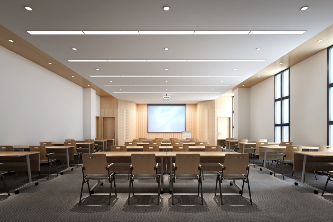 多功能教室的設(shè)計(jì)上我們將墻面和天花的木紋材質(zhì)相連,通過(guò)視線引導(dǎo)的手法,讓學(xué)員的視線集中在講臺(tái),地面的軟性材質(zhì),可以達(dá)到輔助吸引的效果。