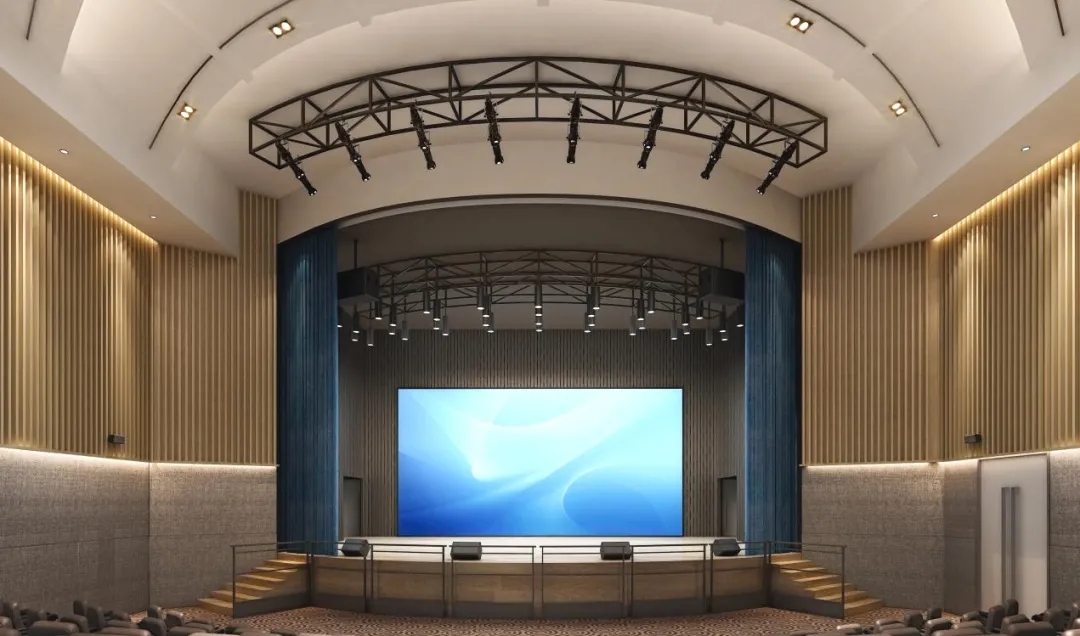 禮堂的設(shè)計(jì)沒(méi)有花俏的成分,主要是對(duì)聲音、光的控制,把墻面區(qū)分為上下2段,減少人在過(guò)高的環(huán)境下照成的不適感。