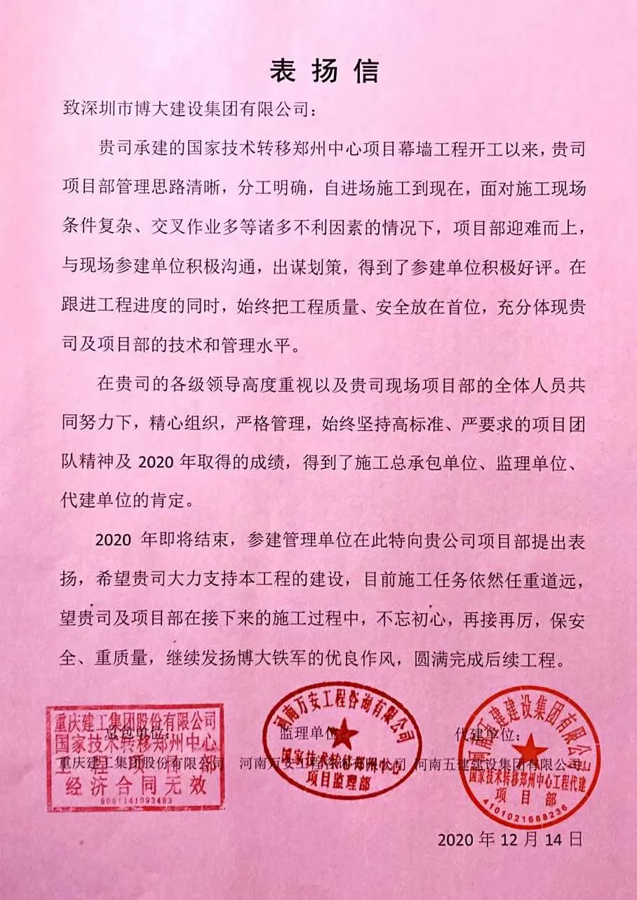 將履約視為生命!這是博大人的莊嚴(yán)承諾和工作準(zhǔn)則。12月14日,博大建設(shè)集團(tuán)國(guó)家技術(shù)鄭州轉(zhuǎn)移中心項(xiàng)目部憑借優(yōu)質(zhì)的履約能力贏得總包單位重慶建工集團(tuán)、代建單位河南五建建設(shè)集團(tuán)、監(jiān)理單位河南萬(wàn)安工程咨詢公司等三方的高度認(rèn)可,并致集團(tuán)總部以表?yè)P(yáng)信!