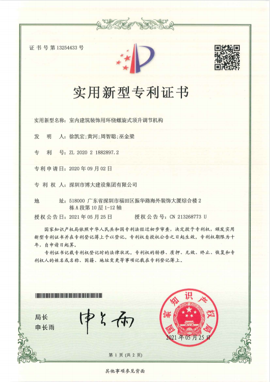 專利成果分別是《室內(nèi)建筑裝飾用環(huán)繞螺旋式頂升調(diào)節(jié)機(jī)構(gòu)》、《一種GRG吊頂安裝結(jié)構(gòu)》、《一種PC預(yù)制混凝土構(gòu)件下的特大推拉窗》、《一種帶有支撐構(gòu)件的超大空間頂轉(zhuǎn)換層結(jié)構(gòu)》、《一種單元拼接式鋁板吊頂或裝飾線條》等22項(xiàng)獲得由國(guó)家知識(shí)產(chǎn)權(quán)局頒發(fā)的專利證書。