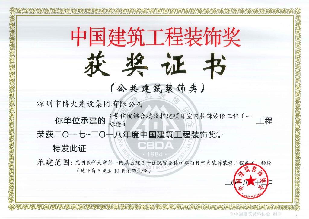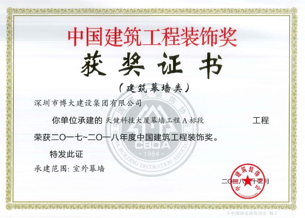 博大建設(shè)集團承建的昆明醫(yī)科大學(xué)第一附屬醫(yī)院3號樓、華遠(yuǎn)金外灘四期君悅酒店、綠景虹灣裙樓商業(yè)公共部分、水貝金座大廈幕墻工程、天健科技大廈幕墻工程等5個經(jīng)典工程以卓越品質(zhì)榮獲中國建筑工程裝飾獎。