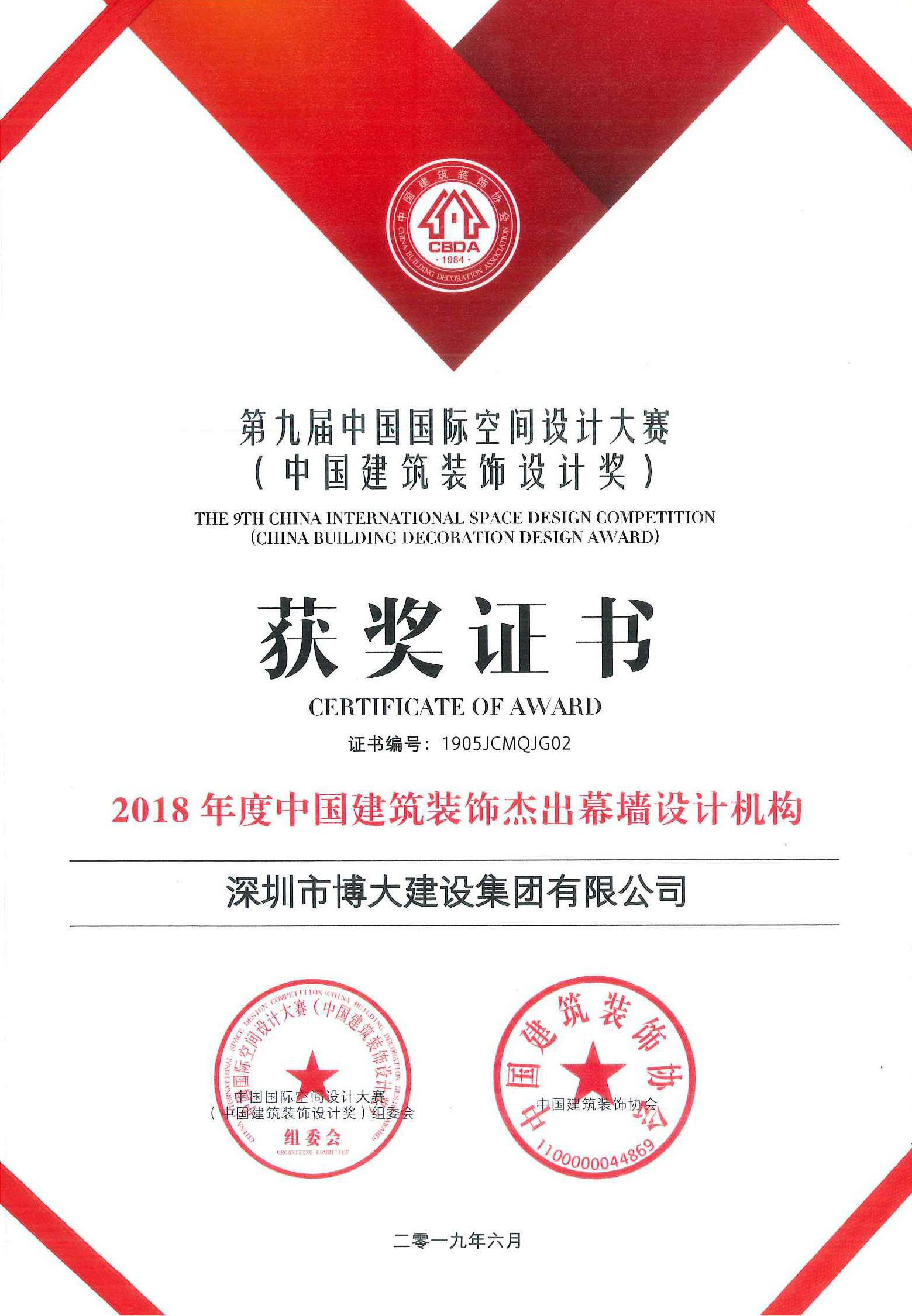 博大獲得2018年度中國(guó)建筑裝飾杰出幕墻設(shè)計(jì)機(jī)構(gòu),總裁李朕鴻榮獲商業(yè)方案類設(shè)計(jì)金獎(jiǎng),設(shè)計(jì)院院長(zhǎng)方邵文榮獲娛樂(lè)空間方案類設(shè)計(jì)銀獎(jiǎng)。
